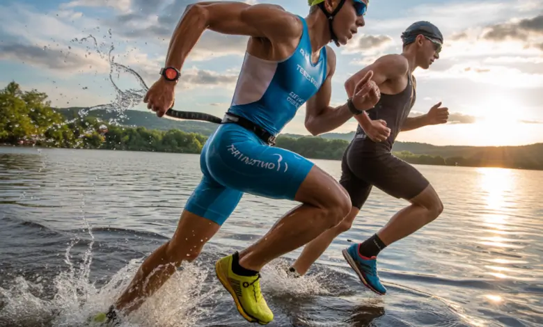 - Swim: Practice open-water sets — sighting every 10–15 strokes, bilateral breathing, and group starts. Add tempo ladders (100-200-300) to build speed endurance.