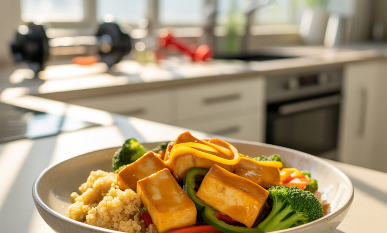 - Strength day (legs or full-body): Lift heavy, then enjoy orange tofu with quinoa to support recovery.